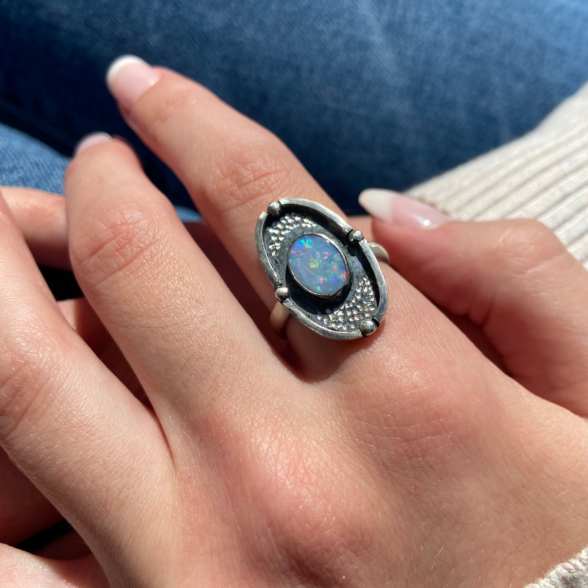 From the Spring Collection this sterling silver ring features a gorgeous Australian boulder opal doublet. Just look at the colors pop as you look at the overall detail surrounding the ring.