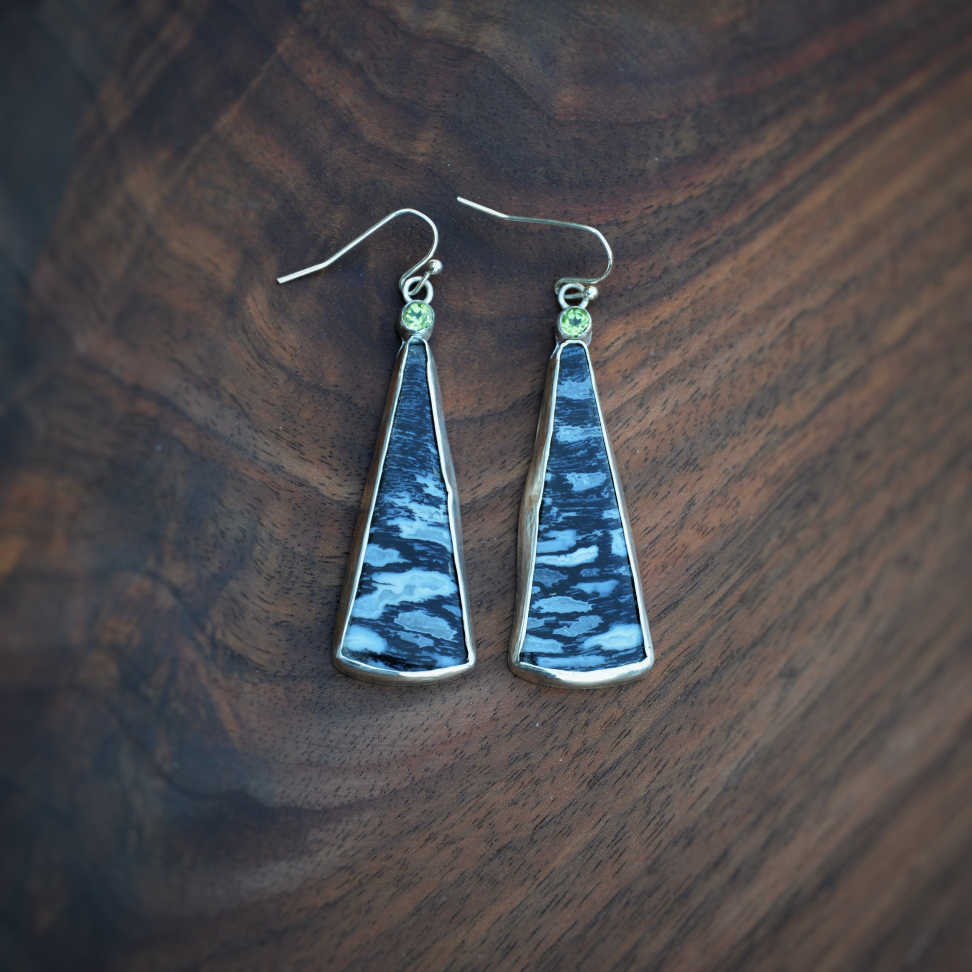 These earrings feature black petrified wood cabochons with pops of quartz crystal throughout topped with brilliant cut Peridot stones all held in Sterling silver. Perfect for any occasion.