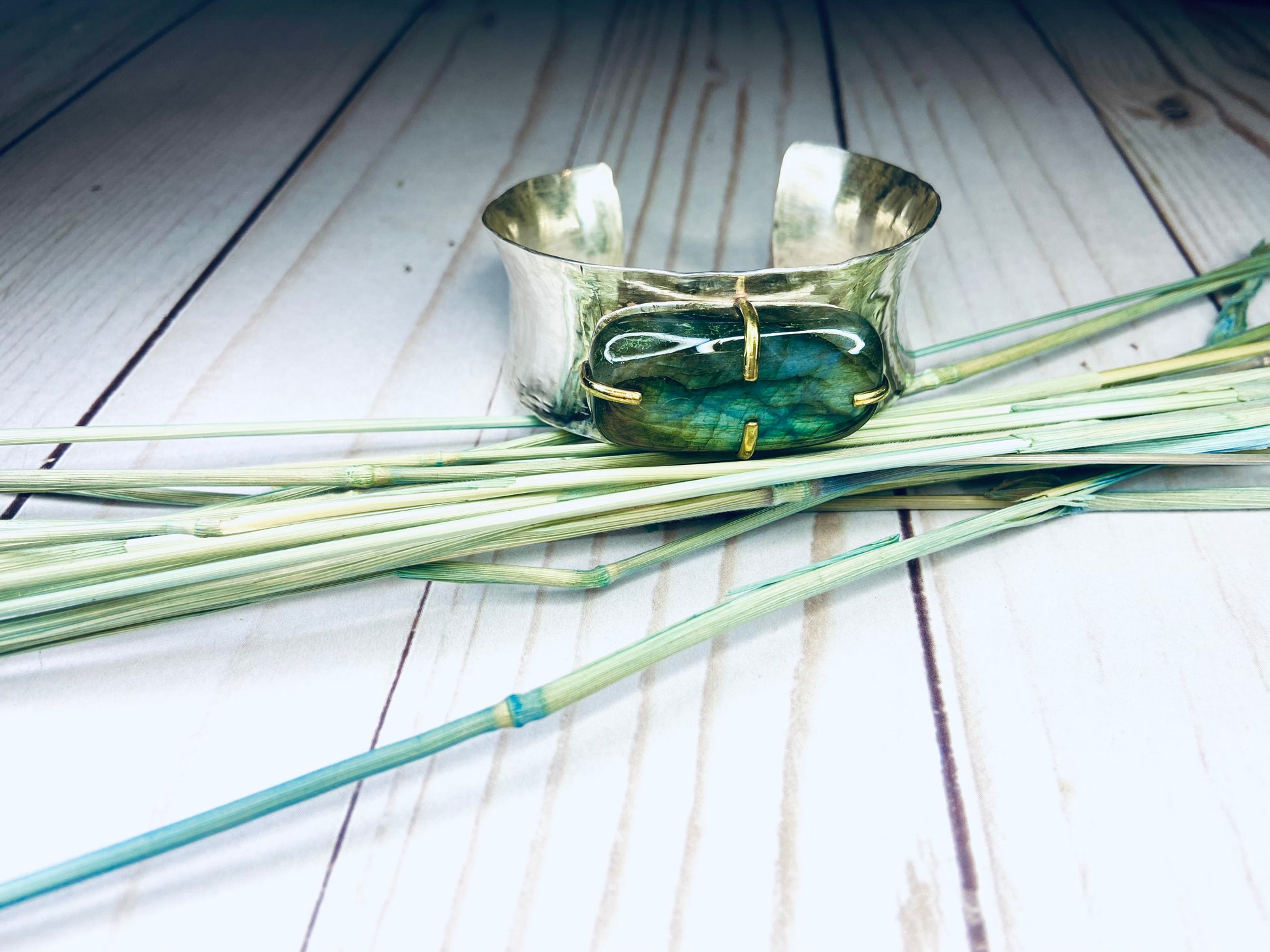 Sterling silver and brass this gorgeous statement cuff holds a rectangular labradorite stone that screams with hues of blues and deep greens.