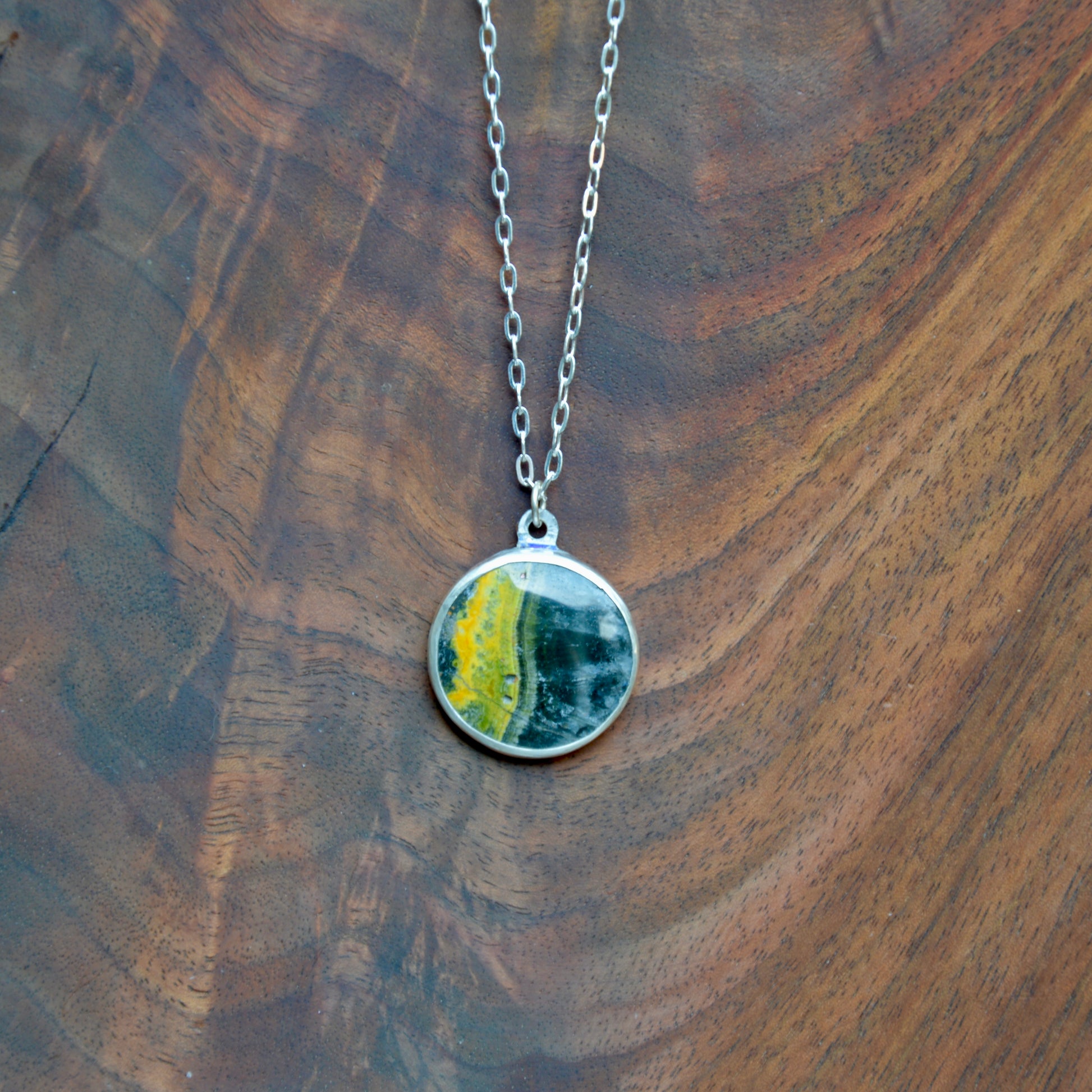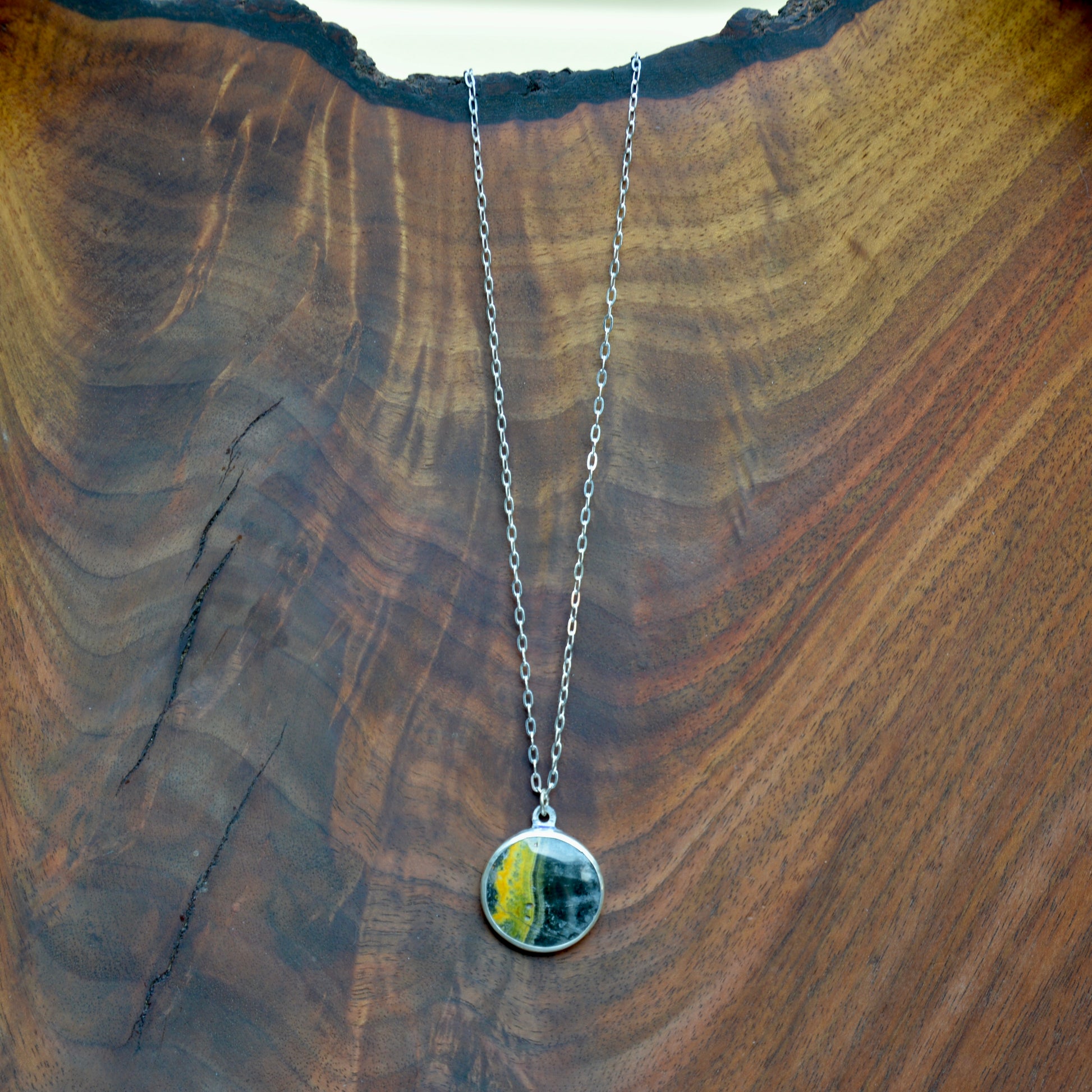 This necklace features a round Bumble Bee Jasper stone set in sterling silver with a flat sterling cable chain.