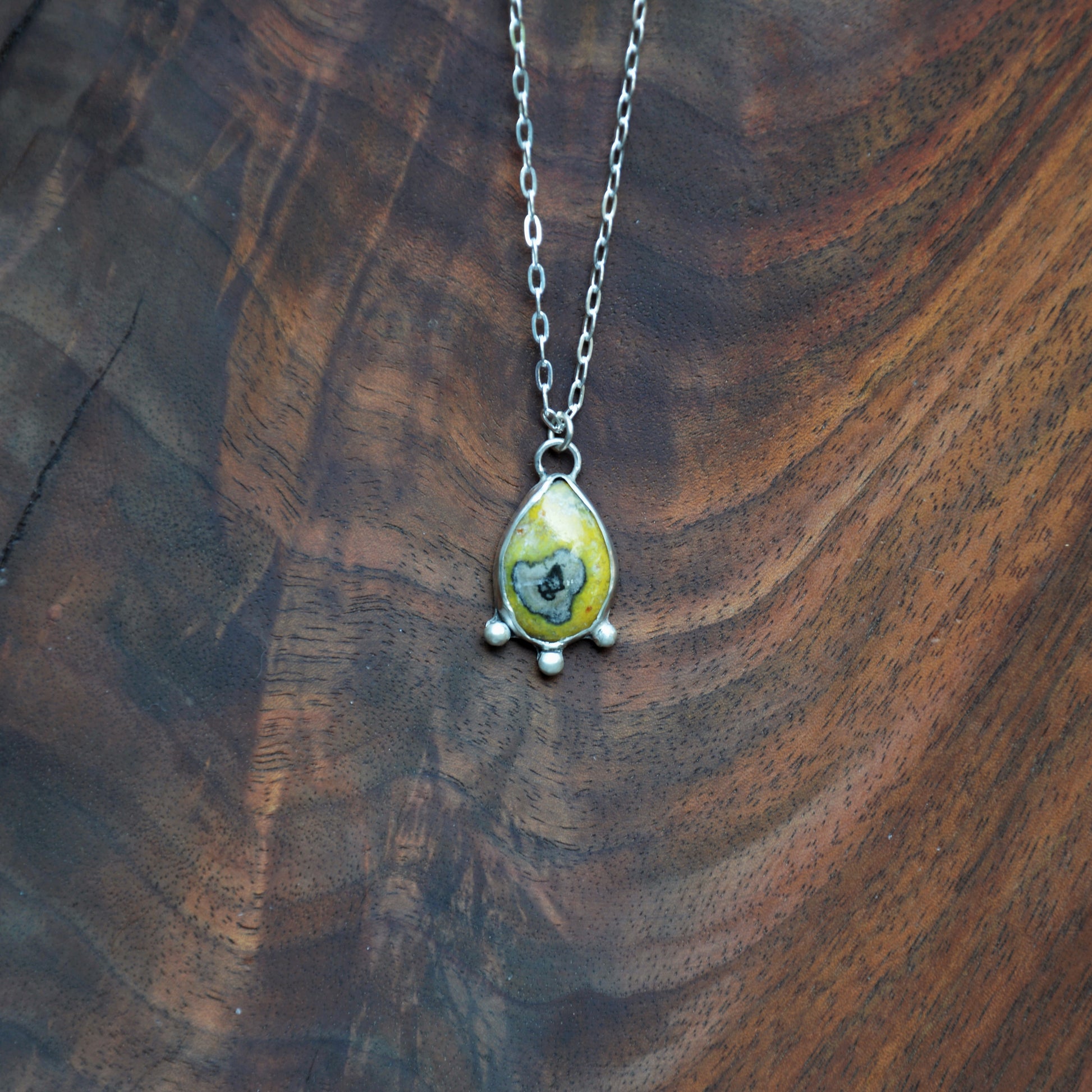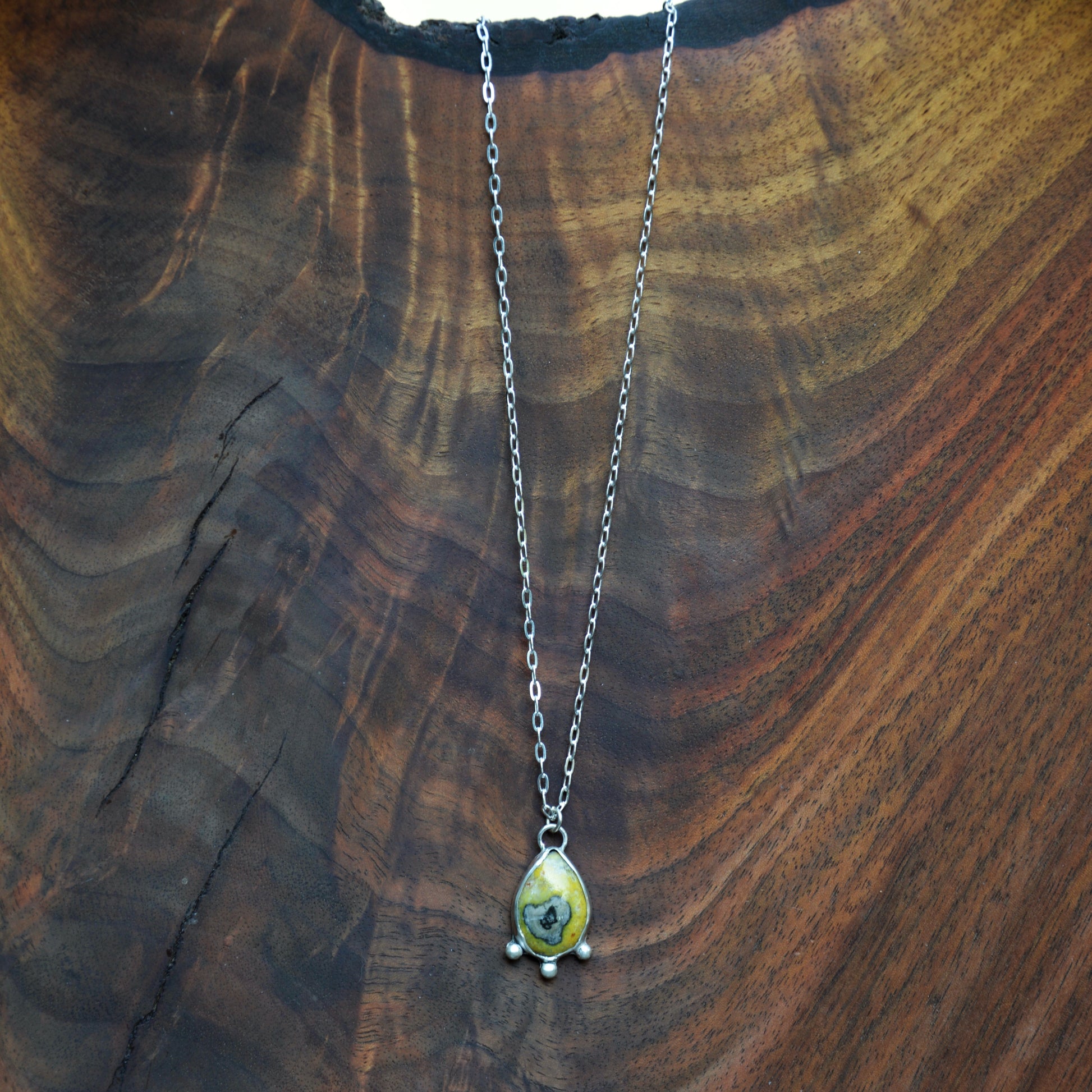 This necklace features an elongated pear shaped Bumble Bee Jasper stone set in sterling silver accented with sterling silver granules. It hangs from a flat sterling cable chain.