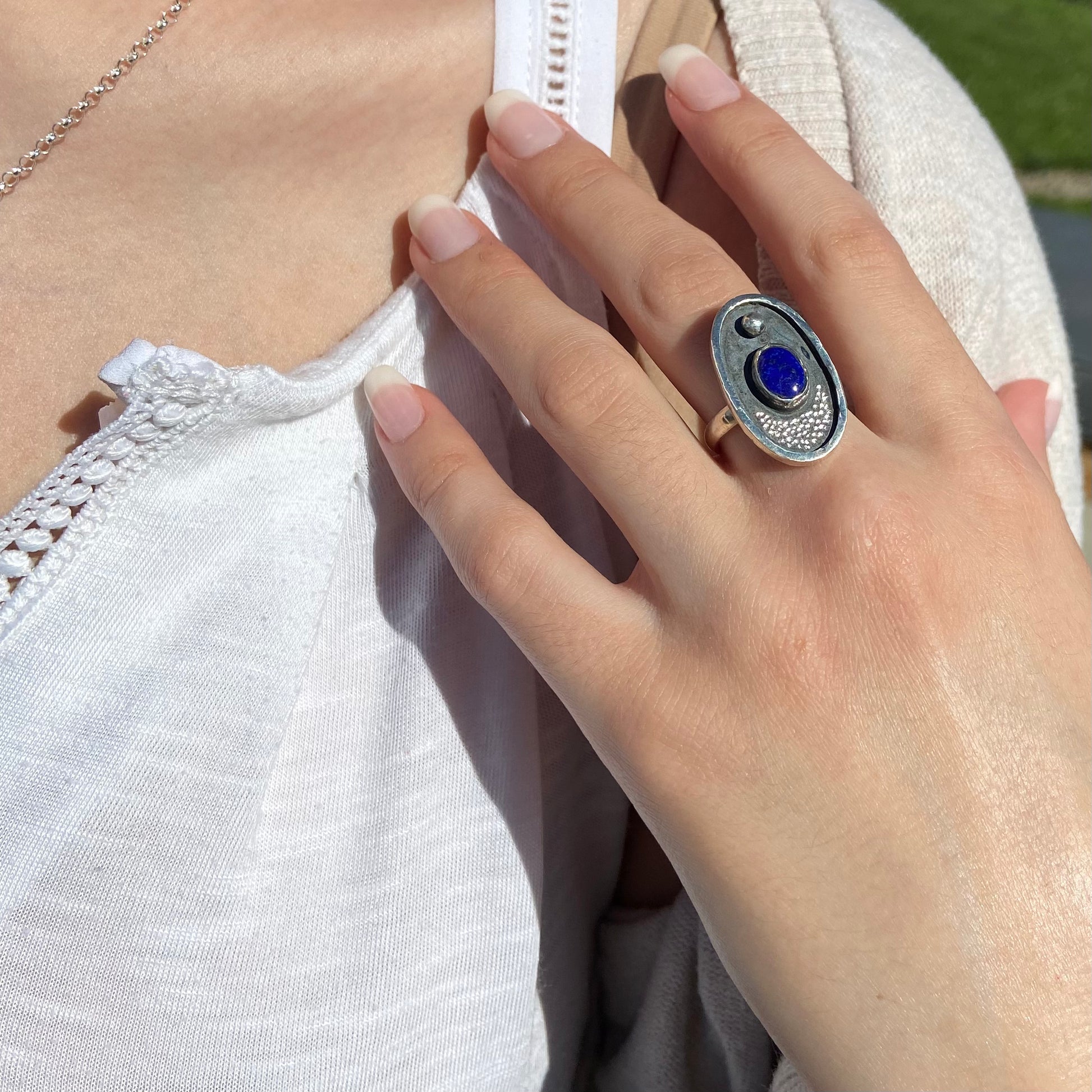 From the Spring Collection this sterling silver ring features a 9x7mm Lapis Lazuli stone. It is so amazing how the moon and tide play essential gravitational roles for one another. Share your love of the ocean and moon with this ring!