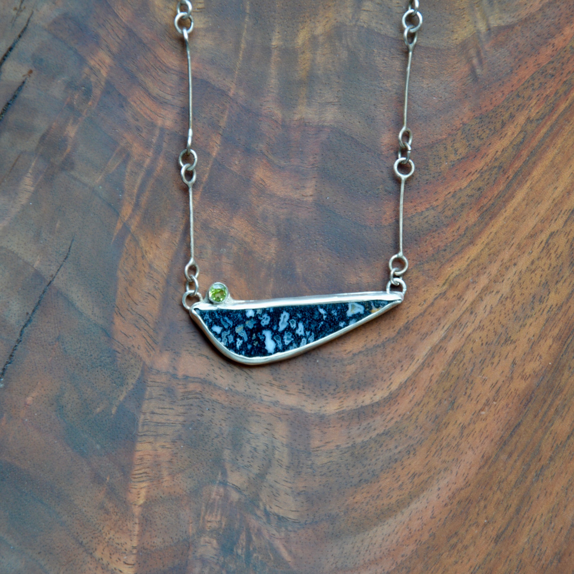This necklace features a black petrified wood cabochon with pops of quartz crystal throughout topped with brilliant cut Peridot stones all held in Sterling silver. The chain is also fully hand fabricated. Perfect for any occasion.