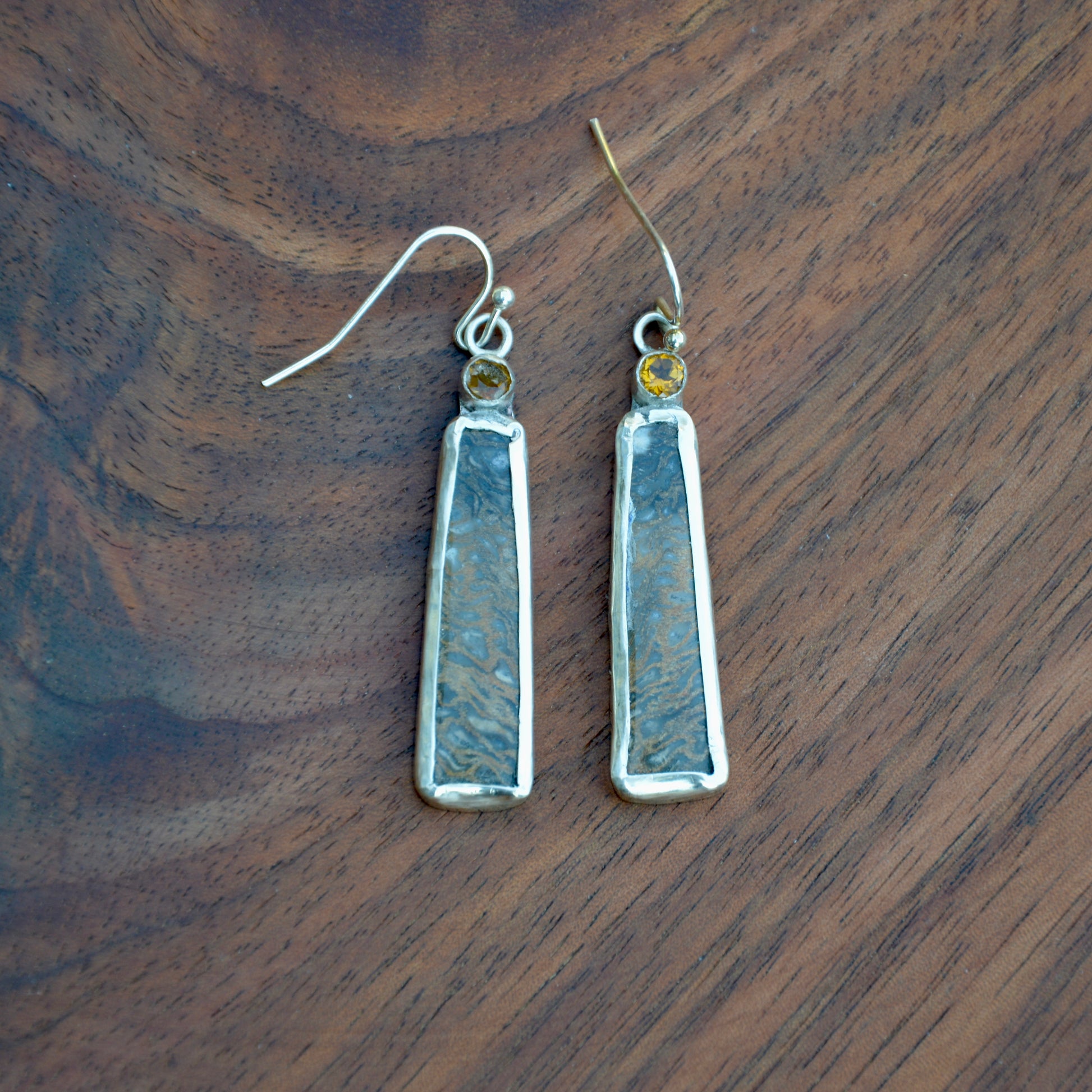 These earrings feature brown petrified wood cabochons with pops of quartz crystal throughout accented with brilliant cut Citrine stones all held in Sterling silver. Perfect for any occasion.